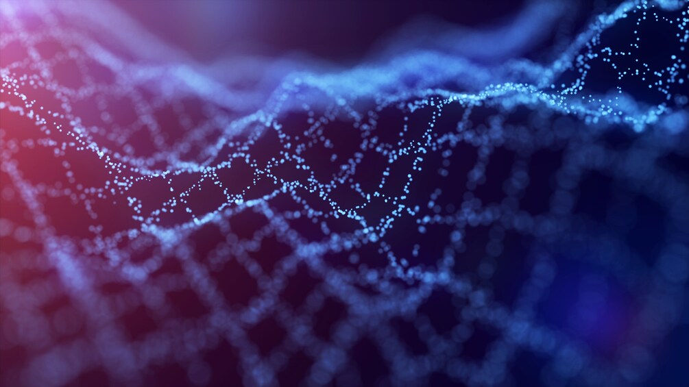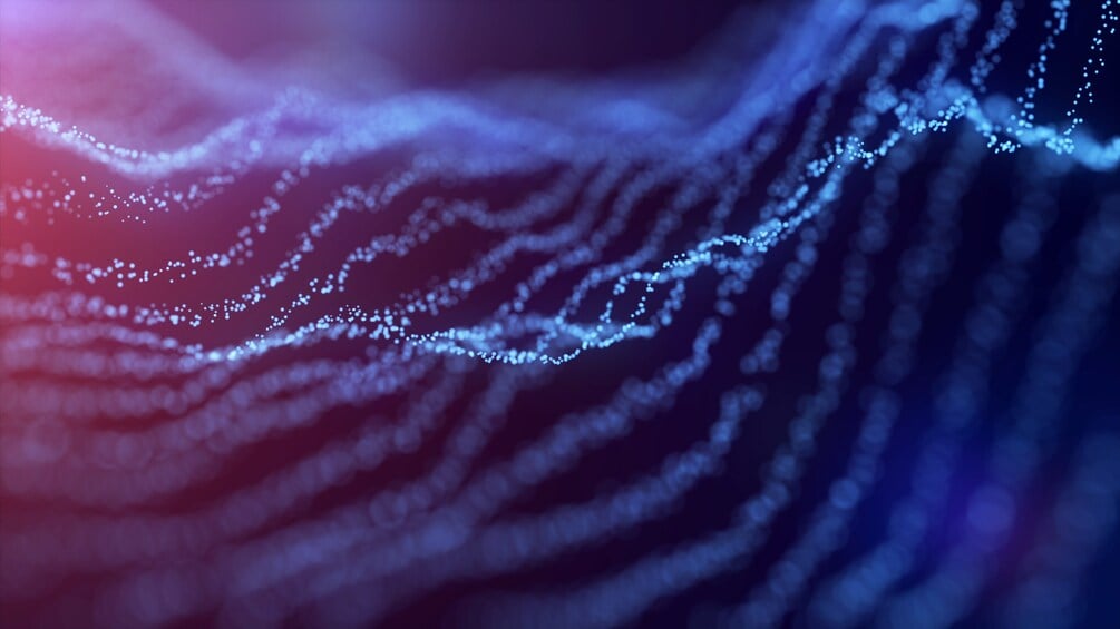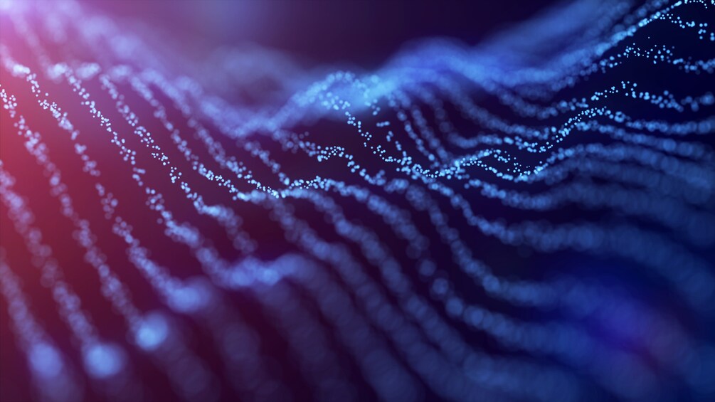 This background of particles with Bokeh effect forms wavy lines that move smoothly on the screen in an endless loop.
