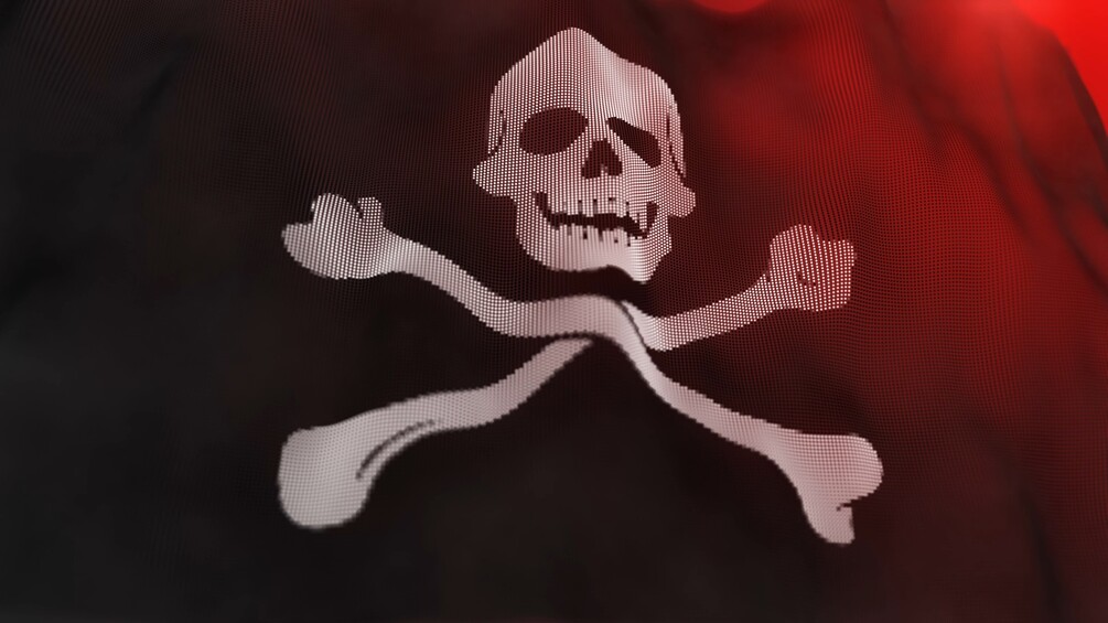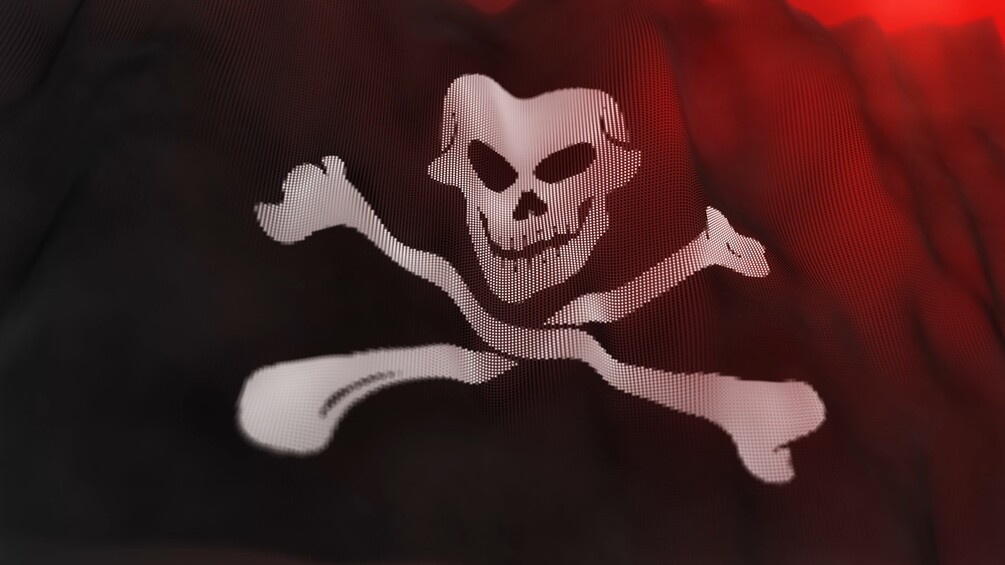 A black pirate flag Jolly Roger (skull and crossbones) made of particles flutters in the wind. Waves animation move across the flag from left to right. A stylized looped flag animation for the background.