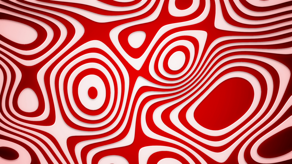 A striped background of red and white curved lines and wavy circles that transform into each other and move across the screen.