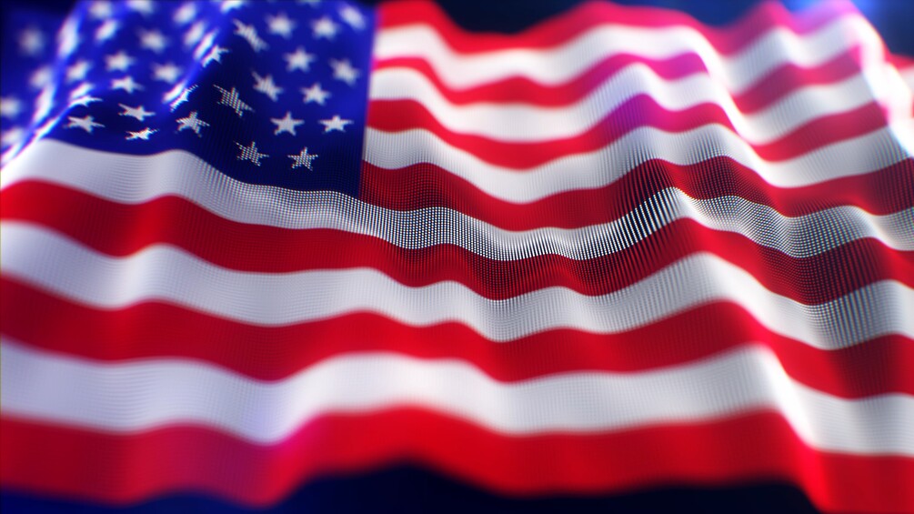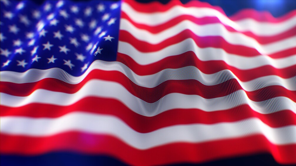 Waving American flag made of particles. Waves move across the flag from left to right. Stylized motion graphics background animation.